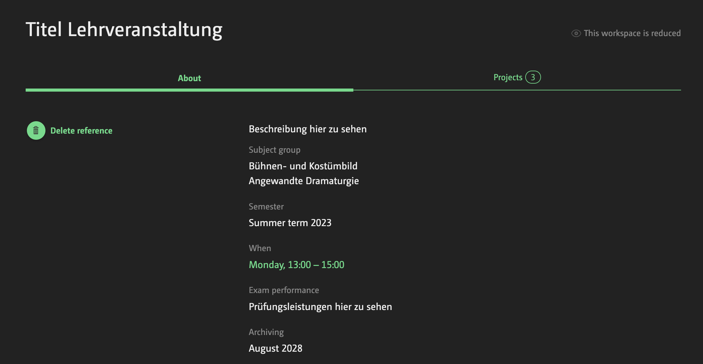 Automatic workspace reduction means that all workspaces older than 5 years (calculated from the workspace’s start semester) will be reduced to the following core information: About text (including the instructor’s name, semester, etc.) and project tabs.