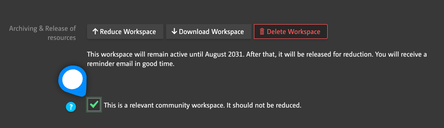 Workspace administrators will be notified one month before the automatic reduction and receive a reminder 14 days in advance so they can prevent the automatic reduction or download the workspace's content.